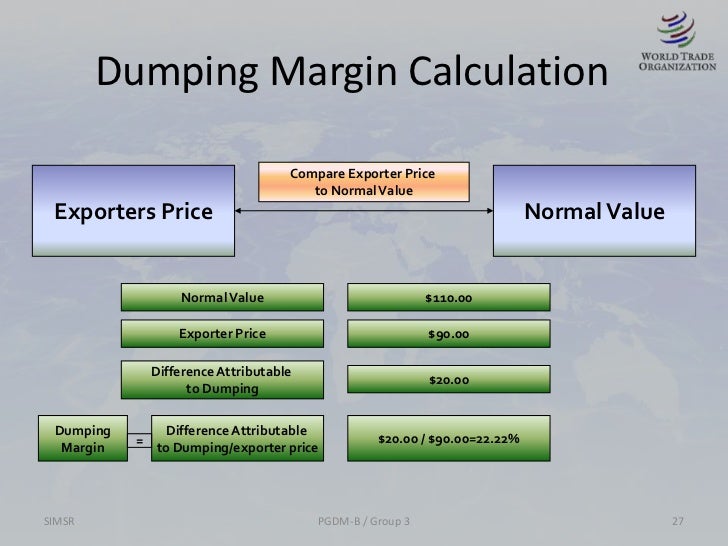 | Dumping margins are calculated by comparing the export price of the product with its normal value in the exporting country. The normal value is typically the domestic price or the cost of production plus a reasonable profit margin. If the export price is lower than the normal value, a dumping margin is established. | ||