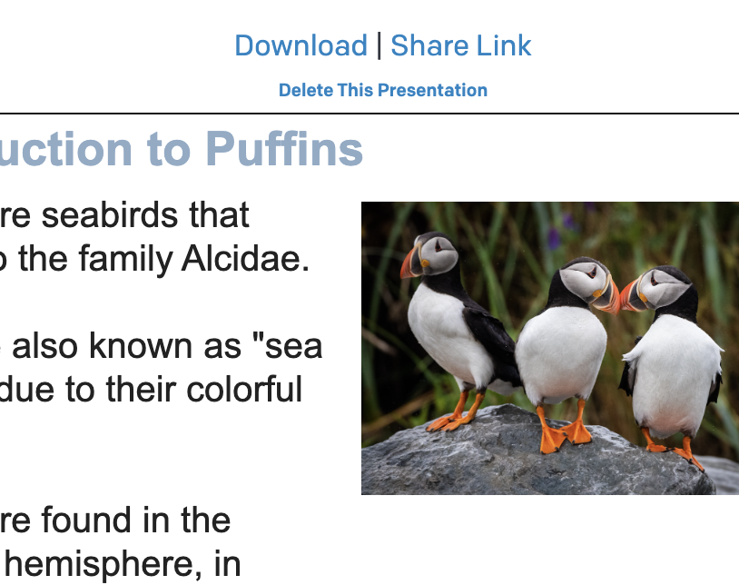 | Visit past presentations on your dashboard. Get shareable links. Delete from share page (if you're the owner). | ![]() | |