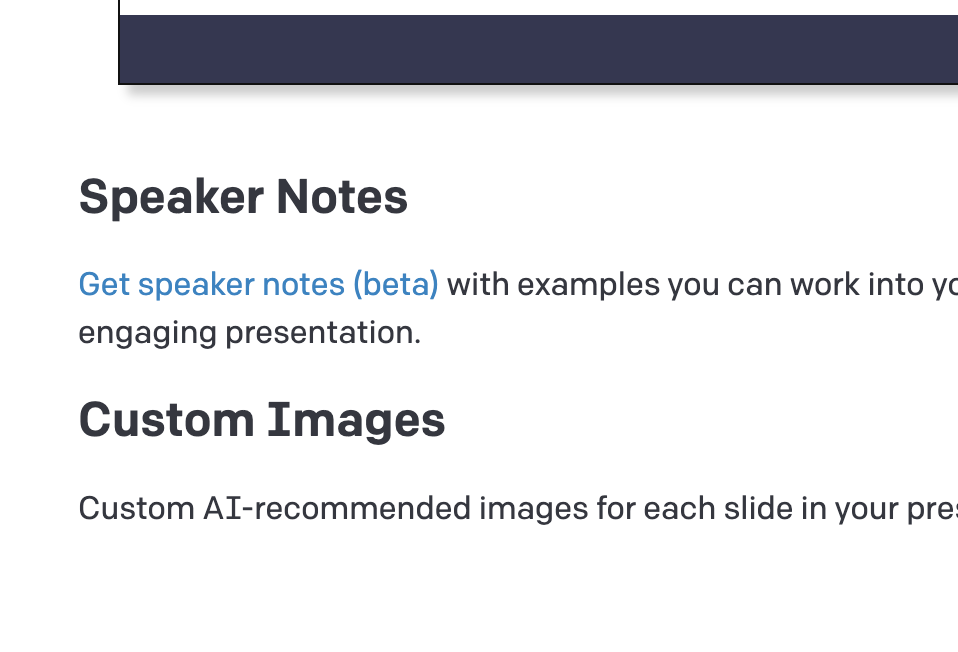 | Create Using Notes: paste any text to create presentations. Create Outline: kickstart your presentation by generating slide titles only. Speaker Notes: browse saved presentations and generate complete speaker notes (below the last slide) | ![]() | |